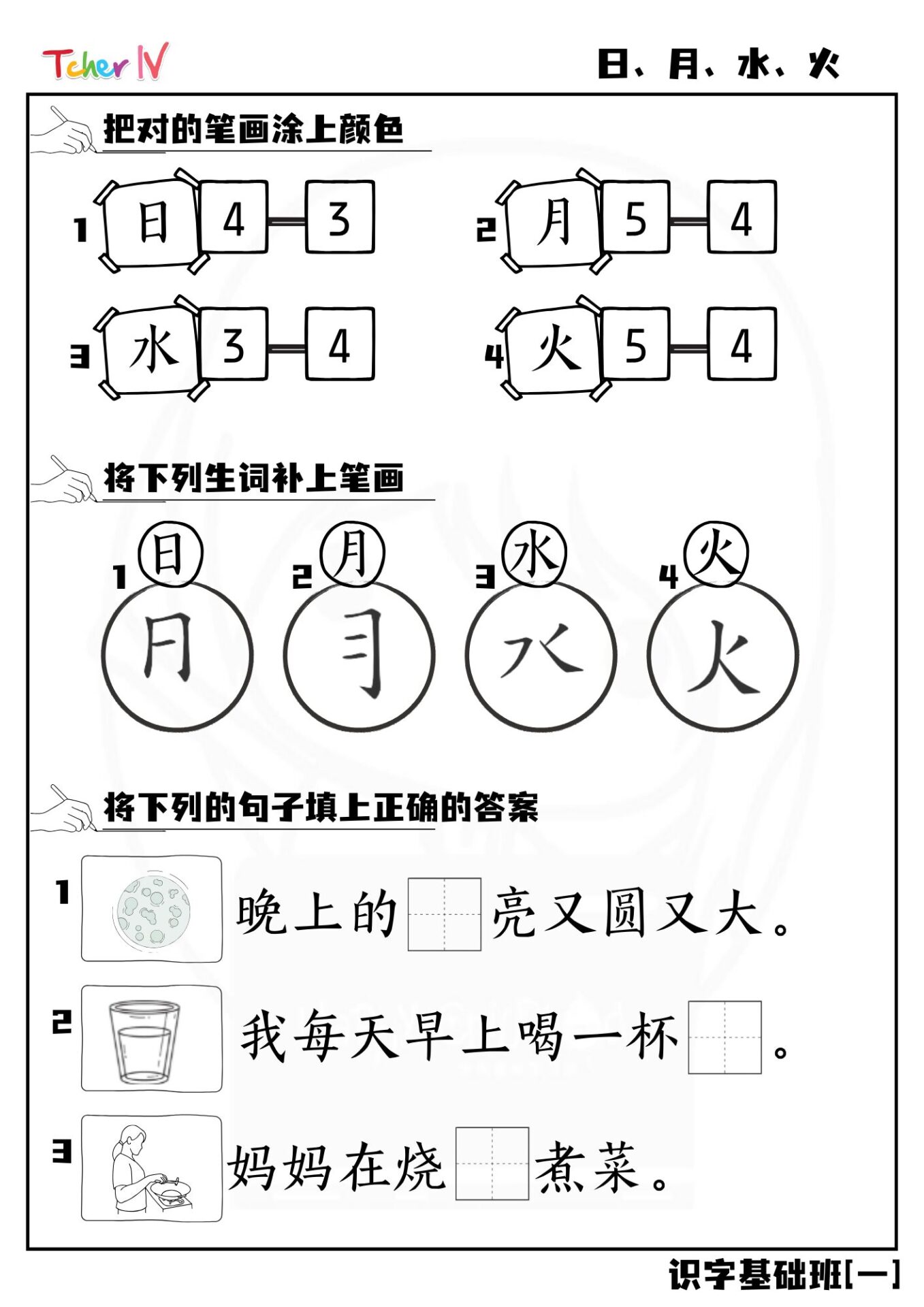 ✅ 从‘日、月、水、火’这些基础汉字入手,先认笔画、再补笔画、最后填句子,一步步帮娃把基础打牢;